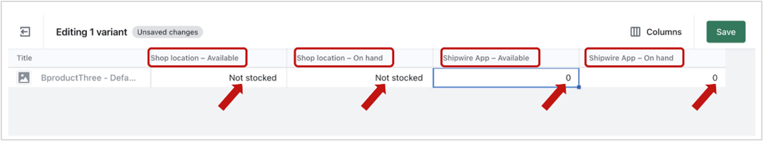 - After changing Shop location to Not stocked, ensure Shipwire App -Available/On hand columns do not have “Not stocked” text in it but “0” in them.